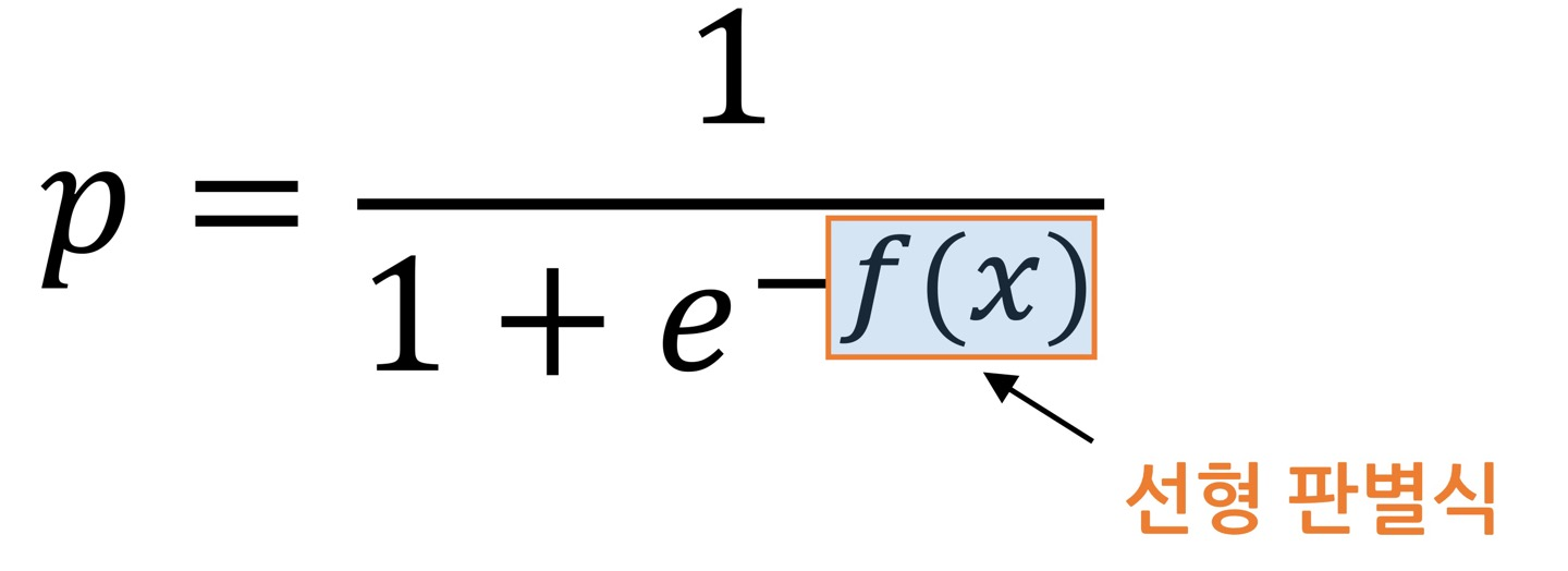 - 확률 값 p는 선형 판별식 값이 커지면 1, 작아지면 0에 가까운 값이 됨