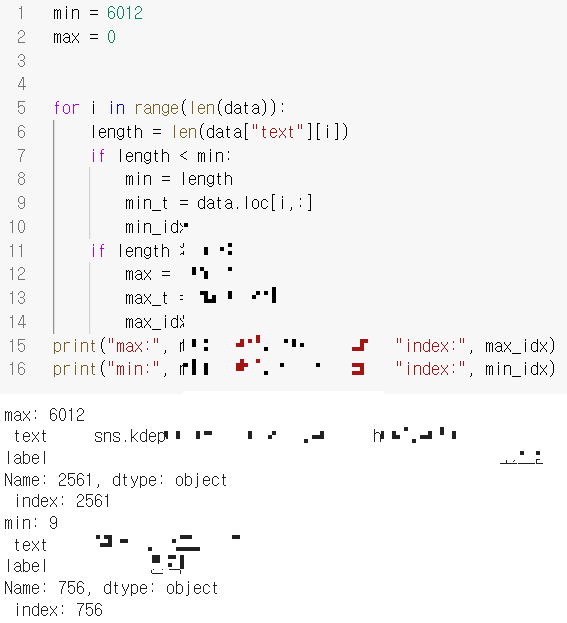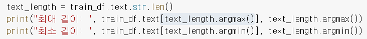 train_df 데이터프레임에서 각 행의 텍스트의 길이가 가장 긴 데이터, 가장 짧은 데이터, 해당하는 인덱스를 구해보겠다.