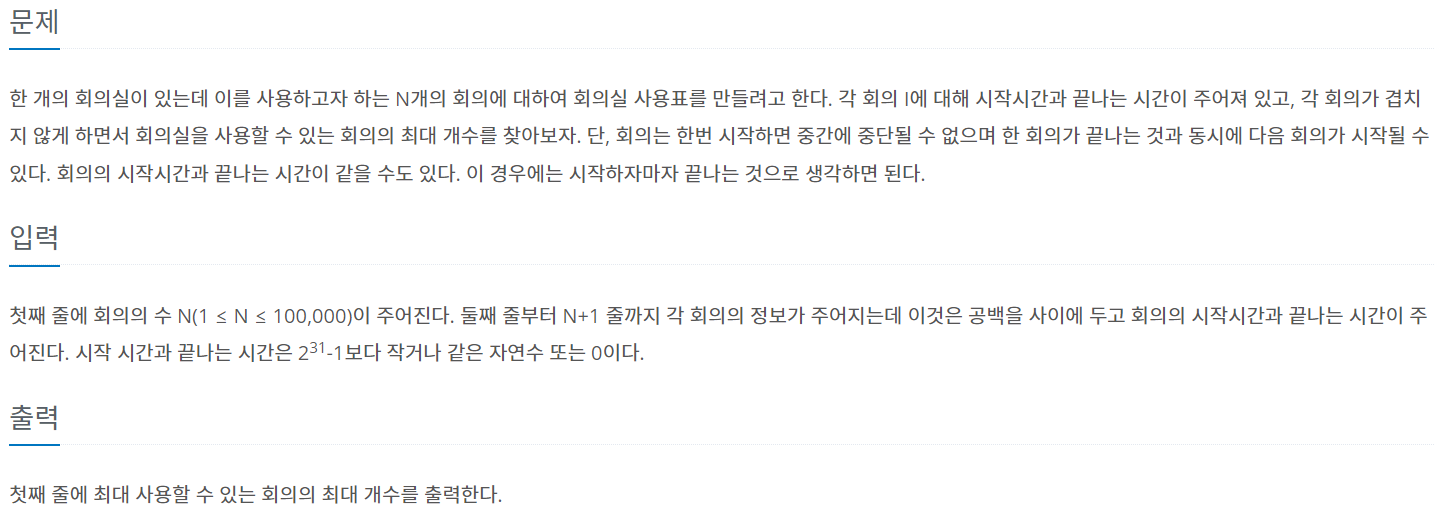 문제요약 N개의 회의에 대하여 회의 시작시간과 끝나는 시간이 주어진다. 한 개의 회의실에 시간이 겹치지 않게 하면서 사용할 수 있는 회의의 최대 개수를 찾아라. 아이디어 그리디 알고리즘 문제니까 최적의 경우를 먼저 골라야한다. 각 회의의 시작 시간과 끝나는 시간이 정렬되지 않은 체 주어진다. ex) (0,2), (2, 3), (3, 8), (3, 6), (6,9) 가 주어졌다고 가정하자. (0, 2), (2, 3) 고르고 난 뒤, (3, 8)과 (3, 6)중에 (3, 6)을 골라야 최대이다. 현재 회의 끝나는 시간 회의실 이용 가능 끝나는 시간 기준으로 회의실 이용 가능한지 여부가 판단된다. 입력받은 회의 시간들은 시작 시간 기준으로 오름차순으로 정렬해주지 않는다. 즉,..
